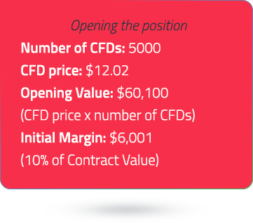 UptrendsFX quotes you a price of $12.52/CFD (being the price at which UptrendsFX is willing to sell you CFDs to Close Out your 5000 CFDs). You trade at that price. The amount of profit you have made, before adjustments and tax, on the Transaction is $2500.00 (difference between 12.02 and 12.52) x 5000 = $2500). With a Margin requirement of 10% of the Contract Value, the Margin requirement for the XYZ position is $6010.00 ($60,100 x10%).